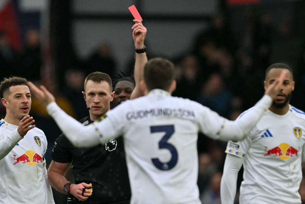 比赛最高潮集中在上半时,利兹一度被裁判的判罚弄得晕头转向。利兹左后卫加布里埃尔·古德蒙森(Gabriel Gudmundsson)因对伊斯梅拉·萨尔(Ismaila Sarr)的铲球被出示第二张黄牌并被罚下,但争议在于裁判托马斯·布拉默(Thomas Bramall)在出示那张黄牌时似乎忘记了古德蒙森此前已经因为对布伦南·约翰逊的一次犯规领到过黄牌。萨尔和马克森斯·拉克鲁瓦(Maxence Lacroix)迅速提请裁判注意,随后红牌才被出示。利兹主帅丹尼尔·法克(Daniel Farke)直言不讳:“根本不该是黄牌(It wasn’t even close to a yellow card)。”帕莱斯球员杰迪·康沃特(Jaydee Canvot)更像得到了恩赐般在古德蒙森被罚下时疯狂庆祝。